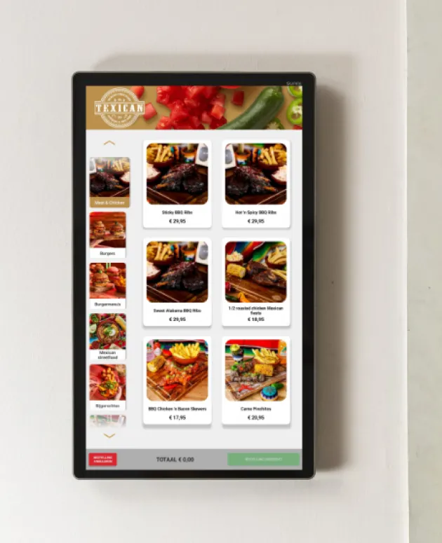 De hardware is beschikbaar vanaf €21,- per maand in leasevorm. Liever kopen? Dat kan ook — we leveren zowel in lease als directe verkoop. In beide gevallen krijg je een compleet werkend systeem, inclusief onze bestelsoftware, updates en ondersteuning. Vraag een vrijblijvende offerte aan voor jouw situatie.